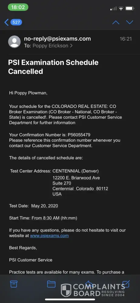 I'm trying to take the real estate broker's exam in Colorado. I was initially scheduled to take it in the middle of March but it was canceled due to covid 19. I rescheduled it for the first week of April. And they had to cancel that one so I rescheduled it for April 16 and they canceled that one so then I finally got a email saying that they would contact me to reschedule. I was never contacted. I had to call them and finally got another date for 20 May. Last night, on the 19th at 5 PM, I got an email saying they had canceled my test for today. When I called customer service what they said was that they are