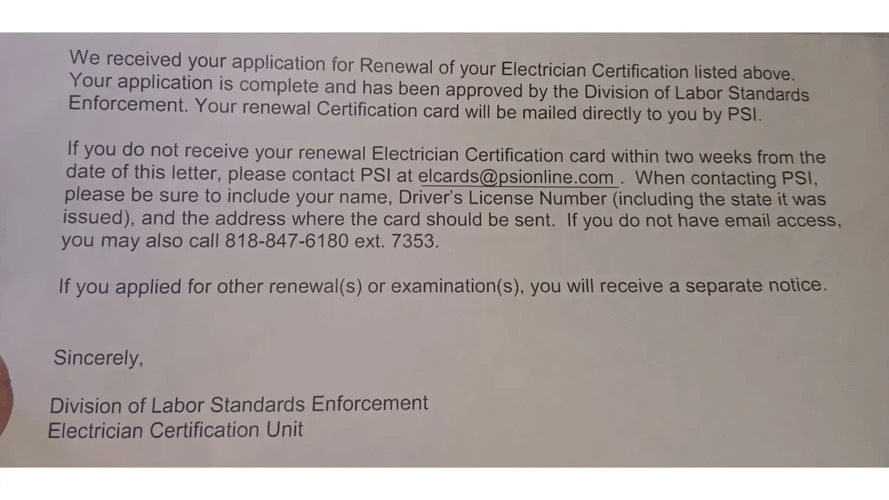 Months ago I sent my renewal application and all the requirements within, including a check for $100. The check was cashed immediately and weeks later I finally received a LETTER stating that my application has been approved by the Division of Labor Standards Enforcement and that I would receive my Certification card directly from PSI via mail. It also stated that if I didn't receive it (my card) within two weeks, to call this number: [protected] ext. 7353.