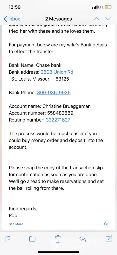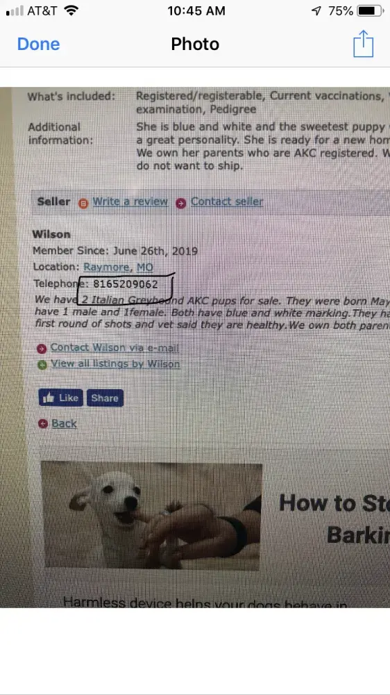 Someone is using my phone number in an ad to sell 2 Italian Greyhound puppies. Sellers name is Wilson. There is an email link listed as well that I'm assuming is being used to gather the pertinent info from the buyer to complete the sale.