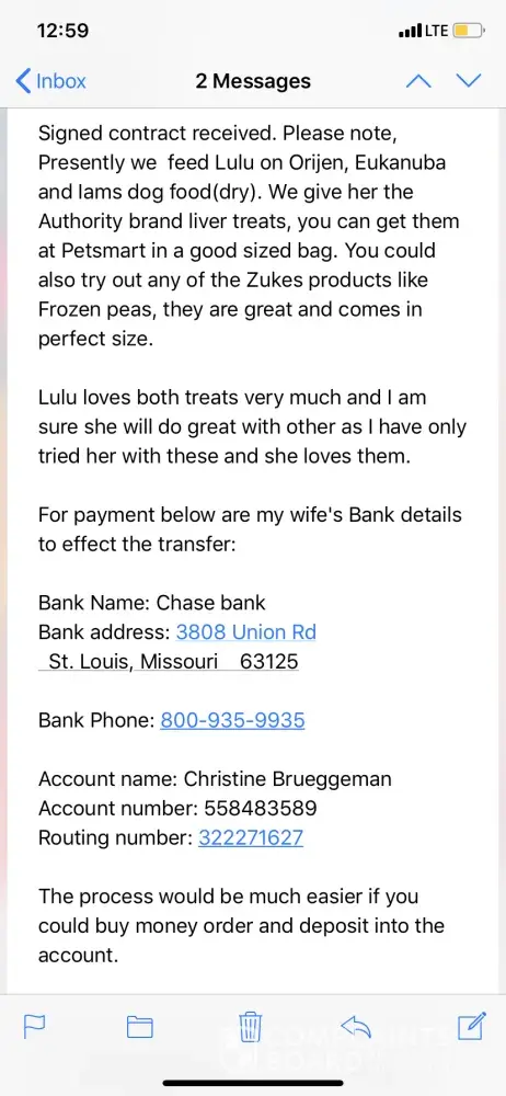 I had the same thing happen to me. Stay away from Starlight Kennel in Missouri Amanda Auria . She took my money and kept the dog, if there really was a dog. I went on puppy find to se if she would do it again and sure enough she was advertising again. When I reported her I was told there is nothing they can do. They can refuse to let her advertise so no one else gets scammed