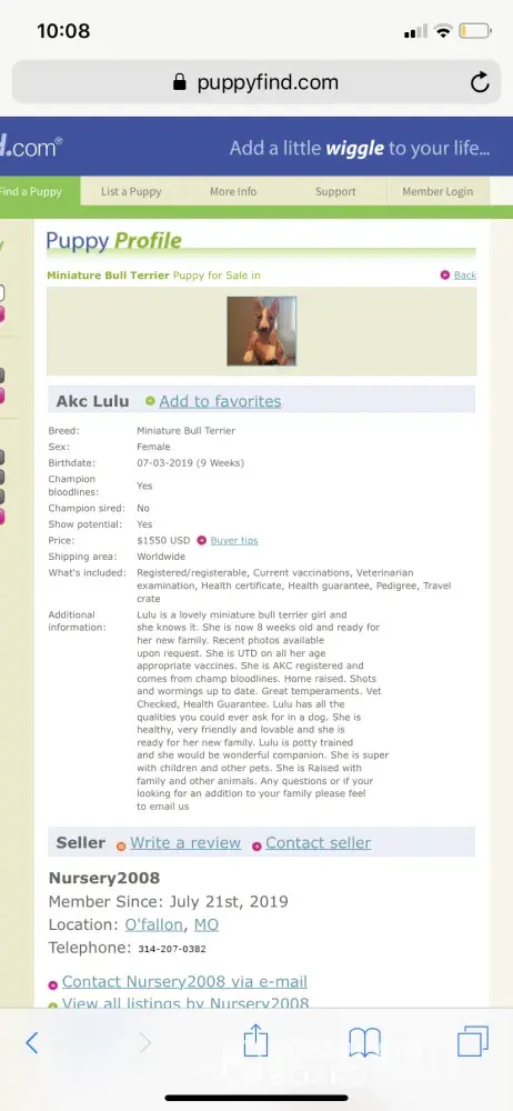 I paid $1850 for a female miniature bull terrier puppy and was supposed to receive it today 9/17/2019 and seller has not provided me with any flight confirmation or anything now seller is not answering my phone calls, messages, or emails