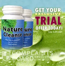 Please don't let my horrible experience be yours. I ordered a "free" sample and paid shipping. THEN I learned the trick is that there is a 14 day trial period. NEVER knew of any 14 day trial- never authorized any further payments, but they did. About 30 days after I ordered my free sample, it shipped out via UPS. By the time I received it, the 14 days was up. When I saw the invoice and that they had charged me a prepayment of $93.95, they refused to reimburse. They said it is Company Policy to never reimburse the consumer. Even though they waited and shipped the Natures Cleanse out on 7-18-09, and I received it on 7-23-09, my 14 days was up and they would not reimburse. This very much appears to be Fraudelent Business Practices and is an Adverse Event caused by apparent fraudulent practices of Pure Nutrients of Melbourne, Fla and Orange, Conn. Please be aware of as you review this product which makes my wife and eye burn by its use (we ordered separately and we tried her product and burned from it). She too went through the same scenerio and was told that the company does not reimburse.
