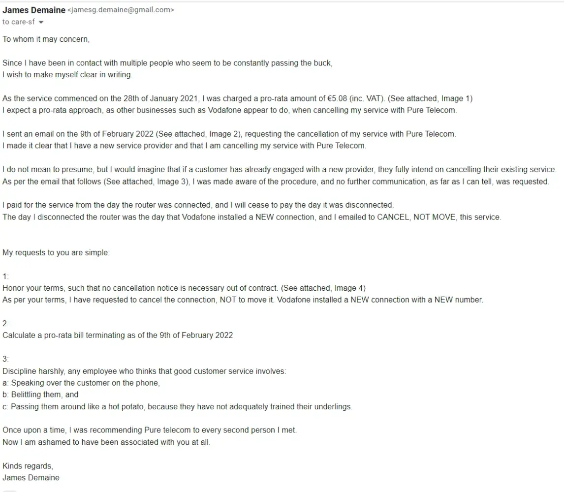 Desired outcome: I would like a public apology on my publicly visible Facebook post, as this behaviour is downright criminal.I would like a pro rata bill that ends as of the 9th of February 2022.