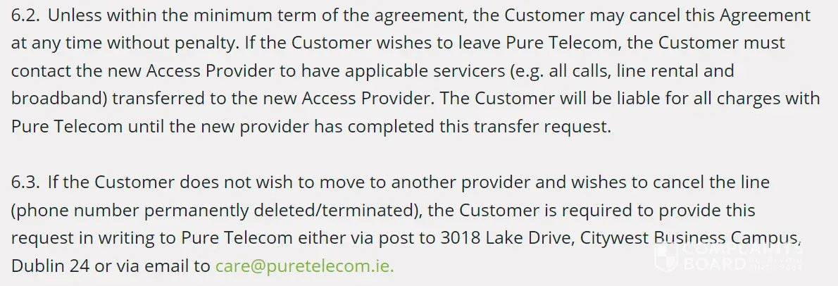 As per Pure Telecoms Terms, I requested a cancellation out of contract. I DID NOT request my service to be moved to another provider.