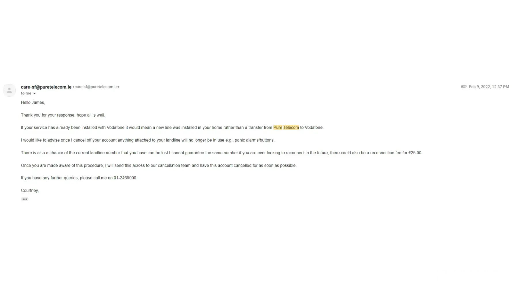 Pure Telecom acknowledged my request, yet failed to fulfill it.