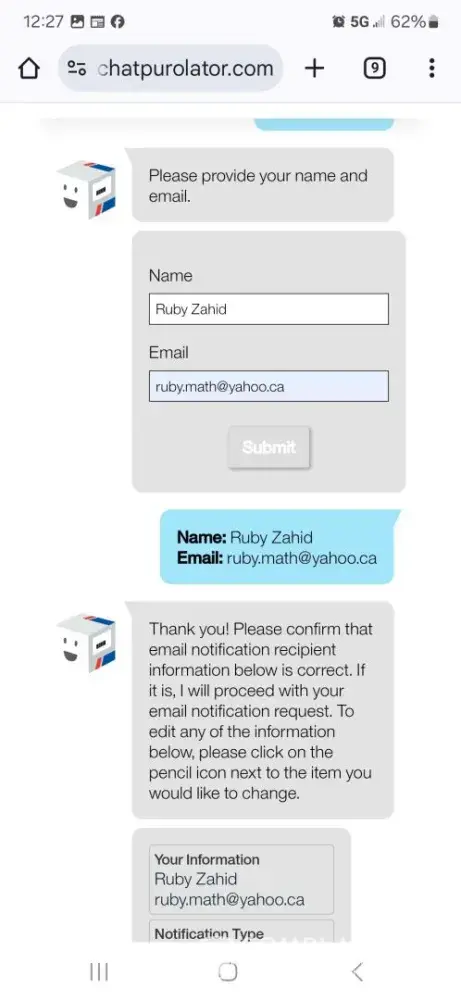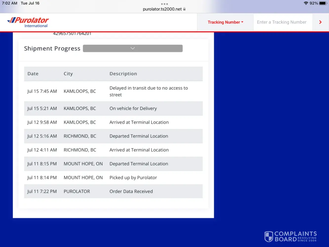 I called Purolator to put in a complaint and was told that it would be a 45 minute wait and would I like a call back.