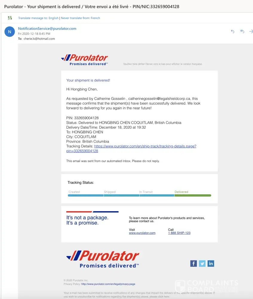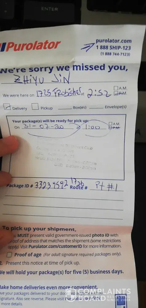Purolator has left an official reply on this complaint.