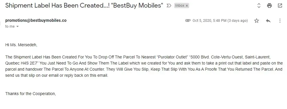 So I want to please you to stop deliver to them by today! And just keep it. I'm following up from bestbuy to check everything. But please don't deliver the parcel to them.