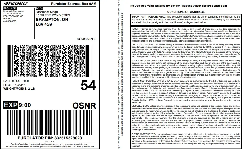 Purolator Shipment