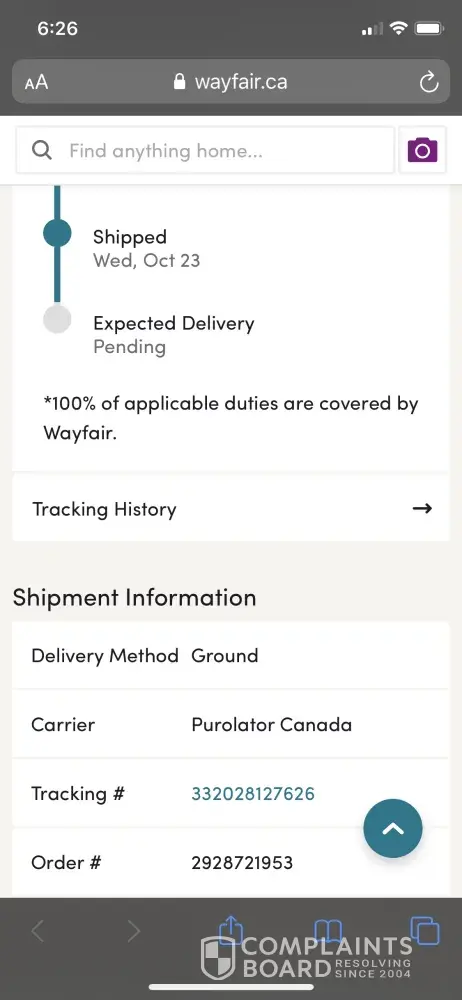 I ordered a floor lamp from wayfair.ca and it was shipped October 23rd with Purolator. I am including the tracking number in the screen shots below.