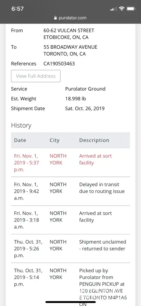Sept. 30, 2019 - 6:27 p.m. TORONTO SORT CTR/CTR TRI, ON Picked up by Purolator