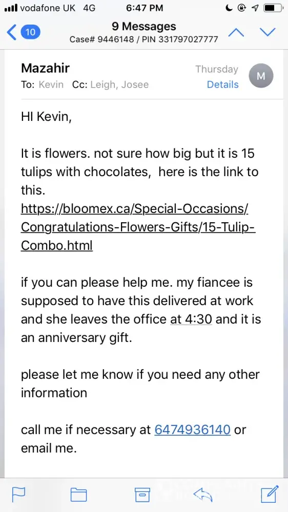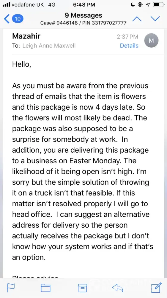 I had ordered flowers with the company Bloomex as a surprise to send to my fiance at her place of work. The flowers were meant to be delivered on April 18th however on the 18th the only thing I could see the entire day was that it was at the sorting facility on the 17th. I decided to call Purolator and they had a tracking specialist look into it. They were communicating with me via email and asked me for details of what the product looks like. I had sent them the exact link to the product so they definitely knew they were flowers. I even explained to them that they were a surprise for my fiance and that they are being sent to her work (so a business). They explained they were looking into it and at the time the communication seemed to be open. Today (April 22nd and also Easter Monday) I receive an email saying that my package is on its way to being delivered. I also get an email from the tracking specialist saying the same thing. I replied to the specialist reminding them that it is Easter Monday and that they are sending the package to a business. Also, my fiance does not work on holidays which is why i asked for the flowers to be delivered on Thursday. I do understand that there are many packages that Purolator receives however I do not understand how they were communicating to me via email and yet they could not ask if it was a convenient time to deliver the package. They had no problem emailing me and I replied very quickly, yet they just assumed they can send it to a business on Easter Monday and expect the staff to be there? Everyone in the email thread knew of the situation because I had specified it. If it was a regular business day then I understand why just sending it out would be a good idea. They also knew it was flowers so I'm not sure why they would assume that throwing it on a truck and delivering in on a holiday to a business would be anything close to satisfactory to anybody on the planet. I would rather someone throw garbage at me. The end result is that my fiance was not at work and will not be at work for another few days as she had taken time off after. She now has a bunch of dead flowers waiting for her on her desk in a box upon her return. I replied to the specialist saying it is a holiday and she offered me the choice of disposing of the package. Wouldn't it have been slightly more proactive to ask me before sending it on a truck and delivering it on a holiday and assuming it will be received? I will be attaching copies of the emails between myself and the tracking specialists. As far as compensation, I would suggest some sort of credit as this is just horrible. Instead of getting some flowers at work, she will get dead flowers at her desk. I understand the flowers are not your problem since Purolator is just supposed to deliver the package. I fully get that. My issue is that the specialists were aware of the situation. At this point, any other solution would have been better than throwing the flowers on a truck. How does anyone assume that someone will be available at work on a holiday? I suggested that they can deliver it to a different address so that my fiance will actually receive the package to which they replied that they cannot change the address once it is on a truck. Who told them to put it on the truck? This is a really ruined sentimental experience for me thanks to poor customer service.