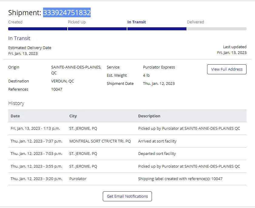 My package was picked up on Jan 12th at Saint-Jerome in the afternoon. It arrived to Montréal in the evening, so it should have been on delivery on the day after (the 13 so today), but instead it was shipped back to Saint-Jerome. When I reach out to customer service, I had no explanation about what this happened and no solution were offered to me to fix the mistake done by your service.