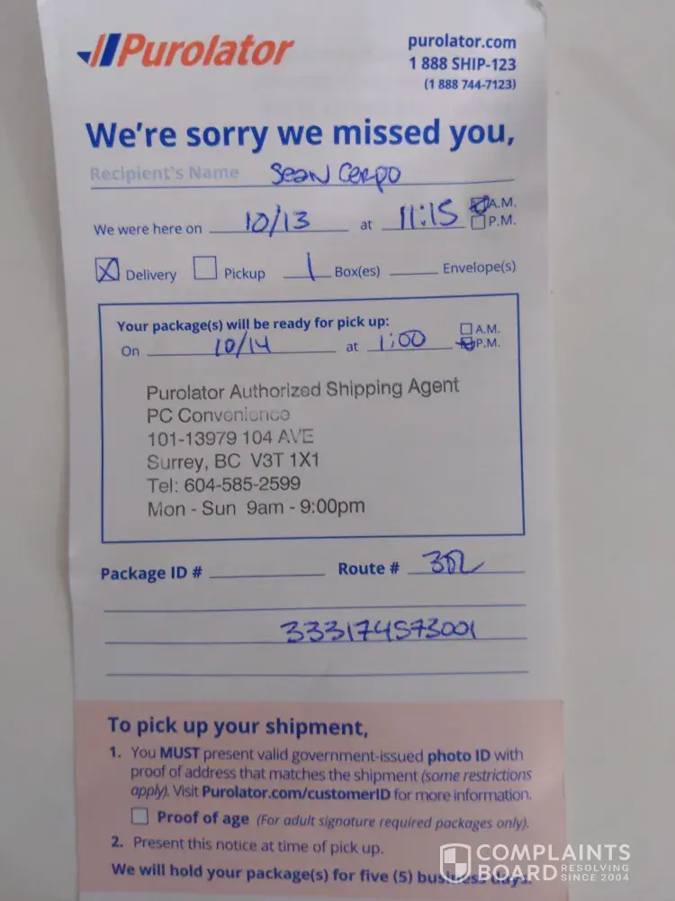 Purolator left me a "We're sorry we missed you." slip on 10/01/2021 and i was home all day.