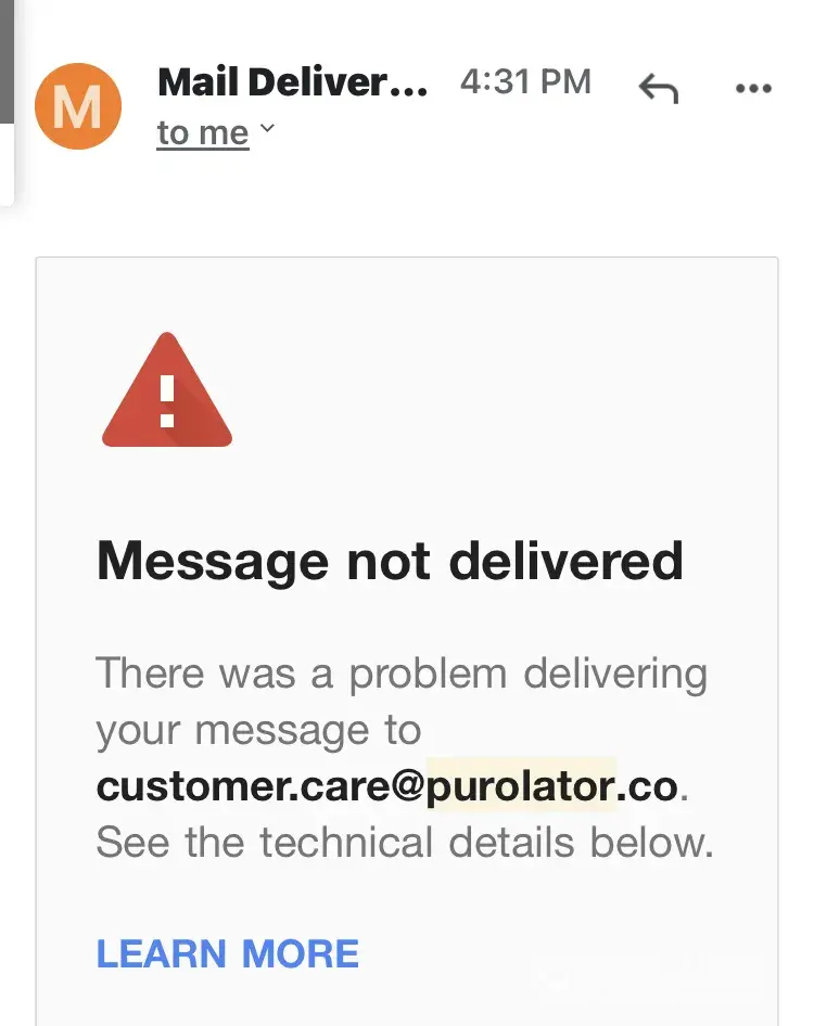 This is what happens when I try to respond to Purolator's response to my complaint. They are playing me, pretending they are concerned by responding with fake email addresses!