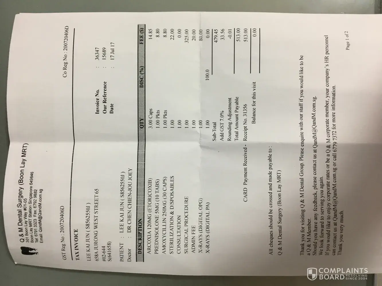 I had complaint to the dentist that I was only being informed of the extraction cost of S$100 and not aware of such so call surgery which cost S$325 being initiated.