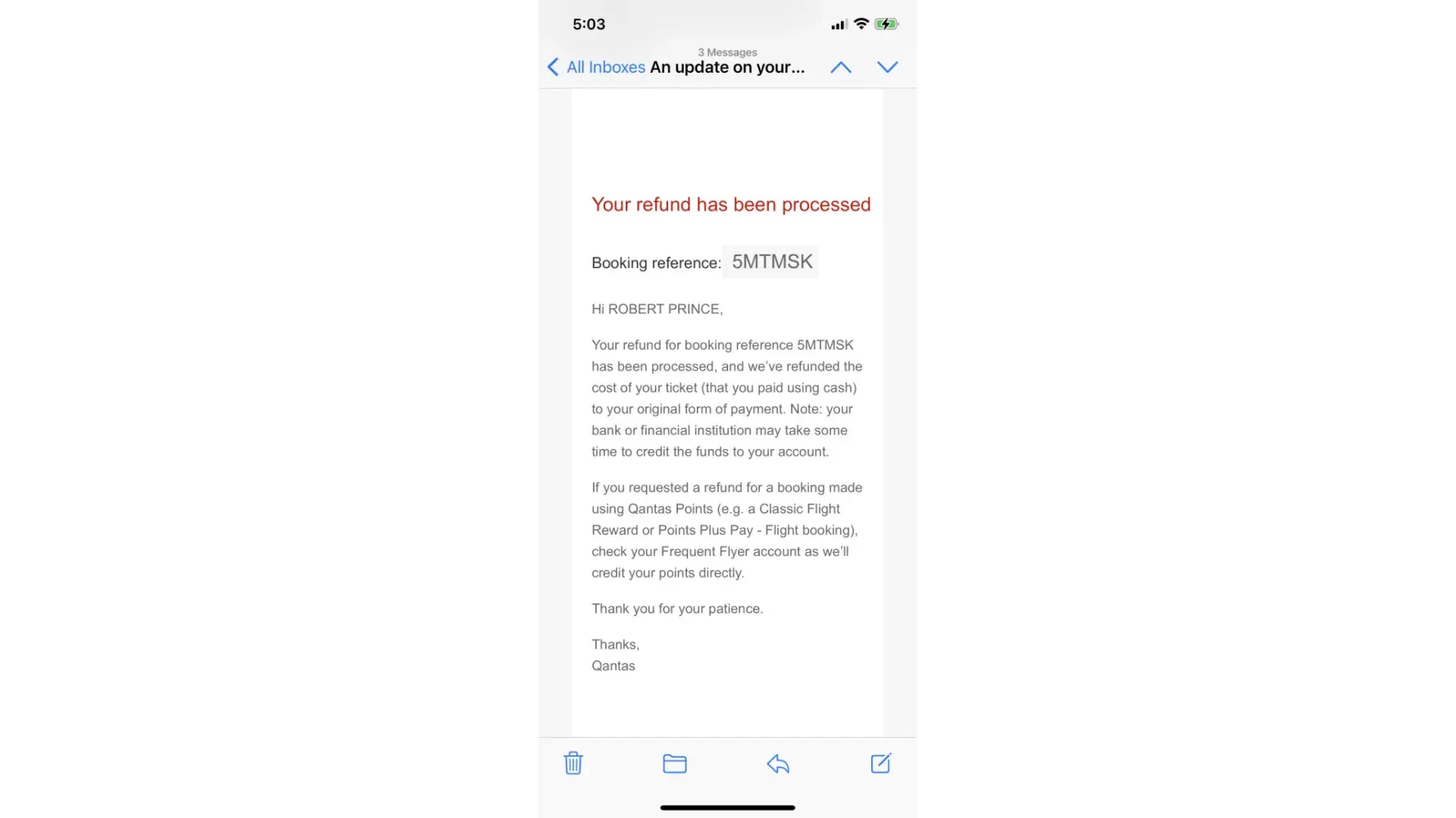 Desired outcome: A Qantas travel voucher for the full amount of the flight booking of $781.90.