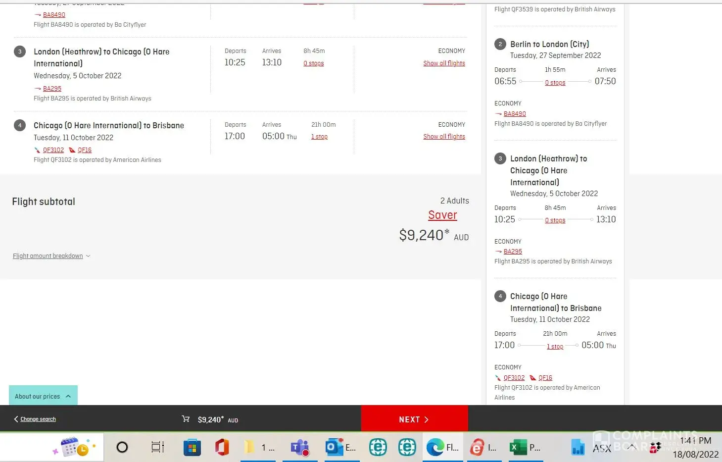 So started again. Selected the same flights. Surprise, the cost had now increased from $8,400 to $9,500. Completed all the fields as before and received the same error message.