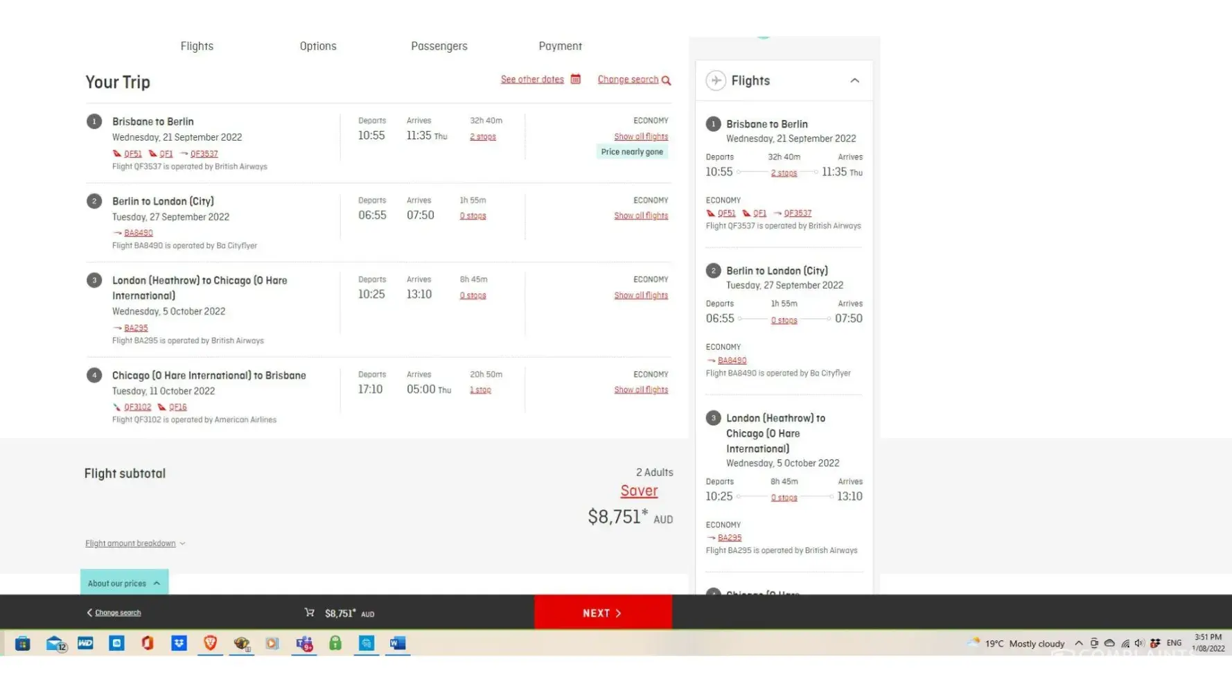 Since Tuesday 26 I have been attempting to a Melbourne - Sydney return flight for my wife and myself - departing 19 August returning 28 August.