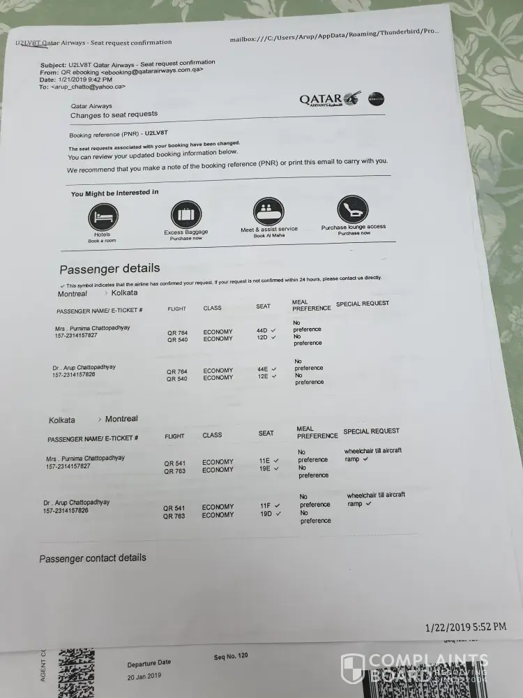 This is regarding PNR U2LV8T. Passengers: Mrs Purnima Chattopadhyay and Dr. Arup Chattopadhyay. Booked date of travel : Monday 20th January 2019.