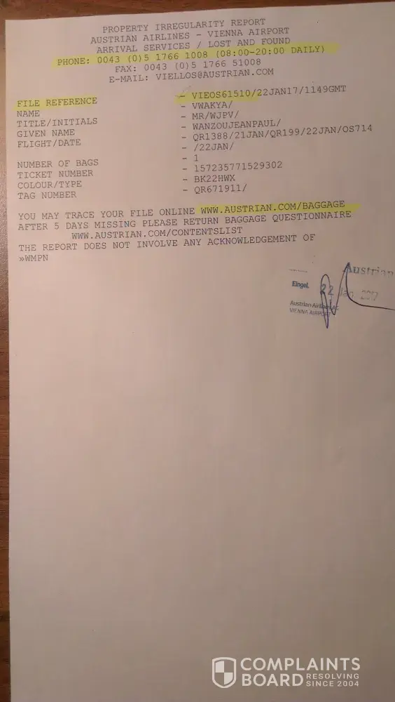 I reported the case to Vienna airport branch of Austrian airline which took me from Budapest (File reference: VIEOS61510) on 22/01/2017 and continue to Salzburg by train (OBB Company).