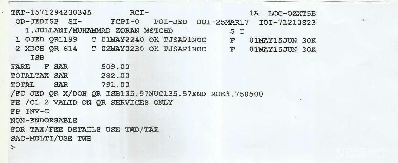 My first trouble starts when I shown my tickets on “Check In†Counter of Qatar Airways at Islamabad International Airport, the staff regretted for my Check In and they ask me to purchase a new ticket of my son from Royal Office because flying dates on ticket are incorrect. After many dialogues there was no way for me & I bought a new ticket (ticket Attached as attachment3).