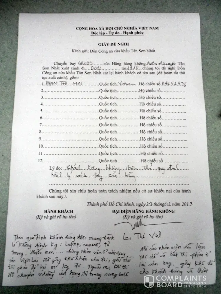 7/When mr Vinh took me to Airport Security to make Record, they just wrote with reason : customer did not accept rule of hand baggages of Company. ( please pay attention: they did not write 15 kg on this record)