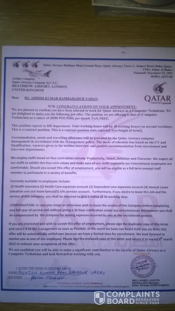 Qatar Airways Job offer letter