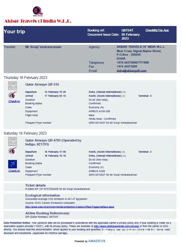 Name : Sivaji VenkataramanQID : 26835626307Contact # : 33302658Qatar Airways Privilege / Silver Club Member [protected]