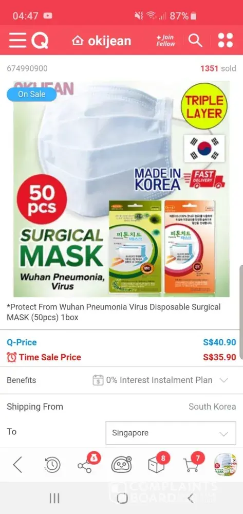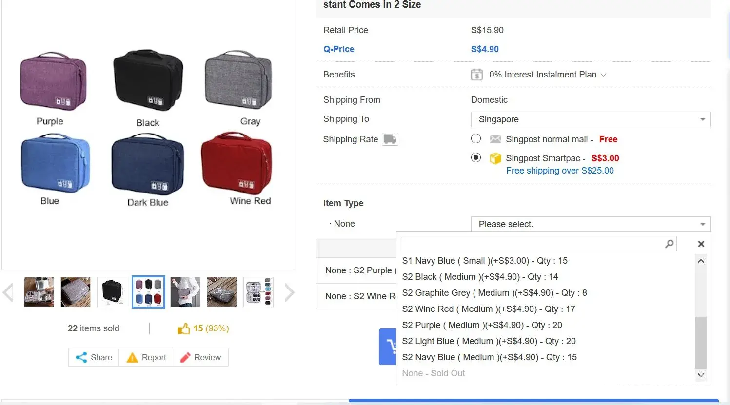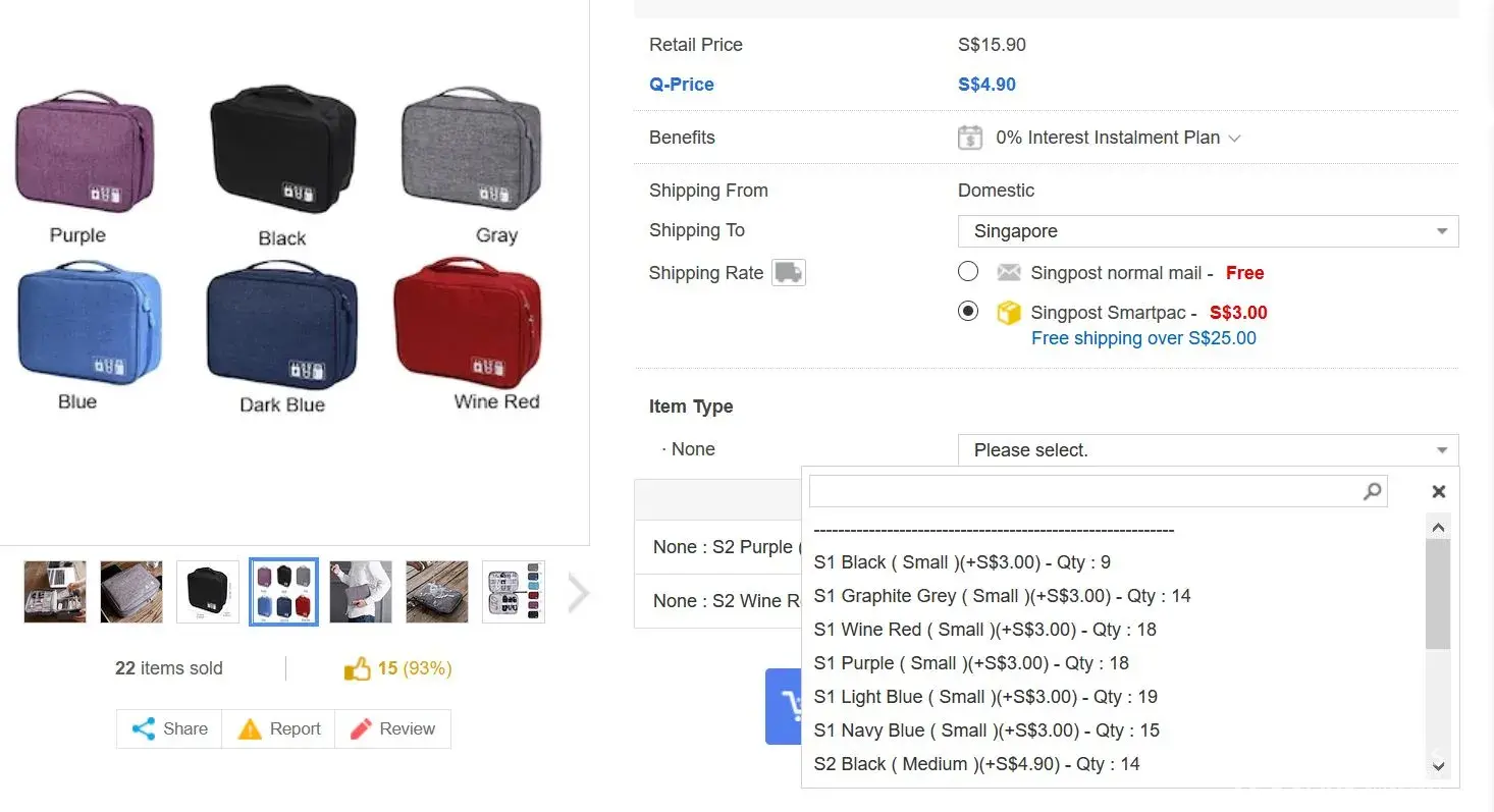 I find it necessary to bring to your attention such false advertising on Qoo10 website. With such advertising, the pricing shown as Q-Price becomes meaningless and useless for prospective buyers. This is because the Q-Price stated is not a true price for the products. The seller shows a "Low" Q-Price of S$4.90 to draw the customer but in reality the actual product price is S$7.90 or S$9.80 when you select the item. Notice that every item for selection has a + S$3.00 or S$4.90 additional cost that leads to the real selling price of S$7.90-S$9.80. So the Q-Price S$4.90 is meaningless since you can never buy the item at this price. A look around Qoo10 website shows this false advertising practice is prevalent throughout Qoo10. If such advertising practice continues then customers will not be able to trust whatever is stated in any advertisement i.e. we lose confidence since we will not know if the advertisement contains factual information. I like to shop at Qoo10 and hope that such false advertising practices are not allowed to continue. If the Q-Price is S$4.90 then one should be able to buy the item at S$4.90. If the actual purchase price is S$7.90 or S$9.80, then the Q-Price should show S$7.90 or S$9.80 or S7.90 + S$2.10 for the medium size one and not S$4.90 which is wrong. Please do not allow us to lose our confidence with what we read on Qoo10. Thank you.