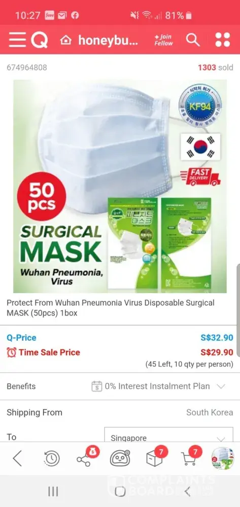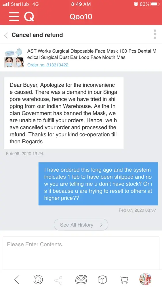 I ordered and paid for 2 boxes of surgical mask on 27 Jan 2020 under the seller Cosmo Junction and the system indicates that it was shipped on 1 feb. Today 7 Feb, the seller says it has shortage of mask and has to cancel my order.
