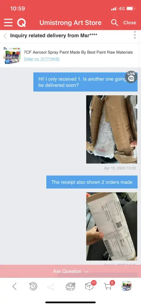 I am writing to complain about a dishonest act by a seller and also poor customer service from qoo10 helpdesk. Ordered 2 cans of spray paint from seller, Umistrong Art Store on April 12, 2020. Only 1 can was sent on April 15, 2020 and straight away, I informed seller that only 1 out of 2 spray paints was sent. No response afterwards and wrote in to qoo10 on April of 16, 2020. Continued to seek response from seller and customer service after a week and still no response. Was told by customer service that it would take a week at least for a response. But, till today no response was provided. Really upset with customer service recovery for qoo10. No options given and no attempt at trying to recover customer's trust. It's not about the value of the item but it's about business etiquette and I surely do not want other buyers to be scammed. How are customers going to trust the platform again if in such a situation, no help is rendered? I would like to be refunded for the one can of spray paint which was not delivered to me.