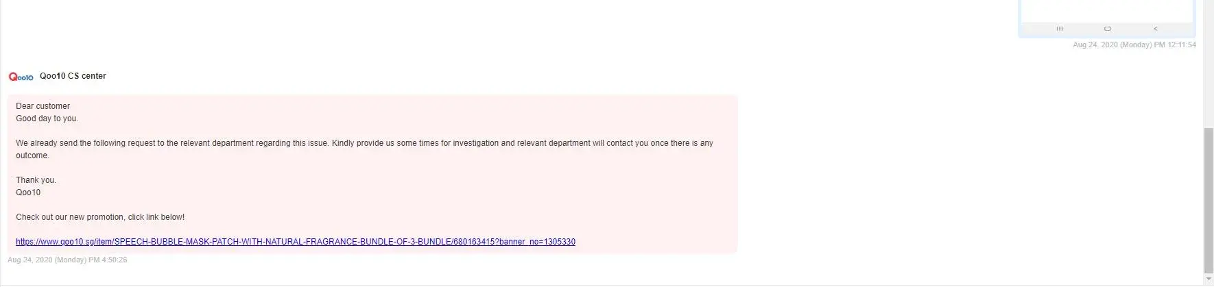 I had informed that a police report has been made but there was only a email reply from qoo10 (see attached) but no further follow up phone call. I am SHOCKED that Qoo10 went ahead with the transaction. I am very unhappy that this is how Q0010 treat a scam report reported by the victim of a social medial impersonation scam. Now i have to bear the cost of this irresponsible action by Qoo10. I would like to hear from the top management regarding the handling of this situation.