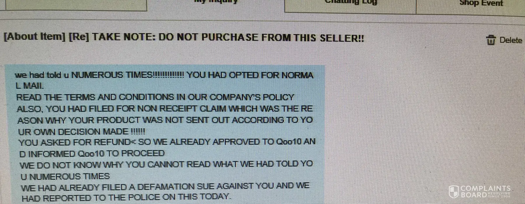 I have ordered a toner on 23rd April 18 via Qoo10 from this company named Cocoxx, last 2 letter xx was hidden for my protection. There was no notice received at all from this seller for a month regarding delayed delivery and I emailed on 25th May to informed them that I have not received the item. They replied they will check and reply ASAP. But I waited till 6/6 still no update from the seller as I submit non item received claim and ask the seller to refund the money back if they can't deliver. They replied they have informed Qoo10. I waited and follow up on the 8th June still no refund notice. So I submit review on the seller website to warn the other buyers not to get cheated for this due to money paid item no received and no refund on 12/6. The seller warned me for my genuine review and remove those reviews and informed to file police report and send legal letter to me for my defamation! I want to complaint here what is the Right of being a Buyer in Qoo10 for such a seller and my genuine reviews? What is Qoo10 action taken for this kind merchant selected? Qoo10 indeed took a week plus after my call on the 14/6 to ask for refund my money back, whereby I have submitted my non received claim since 25th May, why Qoo10 took so long for simple refund and role acting as a middle party?