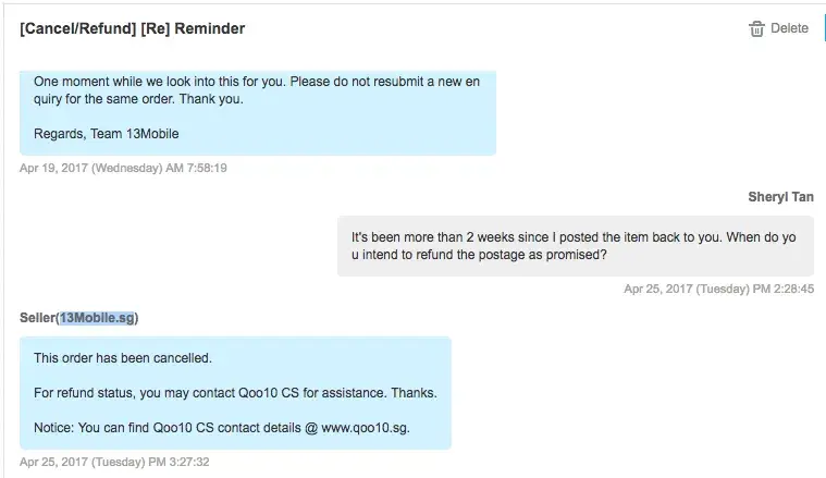 I requested to cancel and exchange one of my orders from 13Mobile.sg when I received a defective product. Somehow, the seller decided to treat it as a simple refund case and did not send me a new product. No matter. But now, they are refusing to refund my postage as they clearly stated they would do. It has been 2 weeks since I returned the parcel and I have still yet to receive any meaningful response from the seller that indicates I will get my refund as promised. I would like my return postage to be refunded.