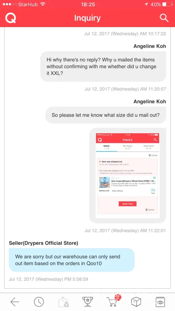 I ordered diaper at the diaper on 11 July 2017, after 10-30 min I realised that I ordered the wrong size. Immediately I went to the Q box to send a message to the seller and wanted to asked for a change of size, from XL to XXL during item is requesting.