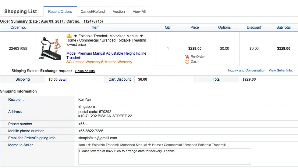 - Extremely slow replies and rude temper. On email, [protected]@[protected]@sg took a week to reply me about the exchange and even then, they replied me one-liners, not explaining at all about the exchange process. When I called the company up, the staff sounded grumpy and displeased and even asked me to email them instead of solving the problem in person (See picture). Delivery company only contacts customers 2 days prior to delivery date, leaving us in the dark about when the delivery would take place. MY FAMILY'S VACATION WAS DISRUPTED BECAUSE OF THIS EVENT. WE WERE GOING TO GO OVERSEAS THIS WEEK BUT COULD NOT DO SO BECAUSE THEY DID NOT CONFIRM WHEN THEY WERE GOING TO DELIVER THE ITEM FOR EXCHANGE.