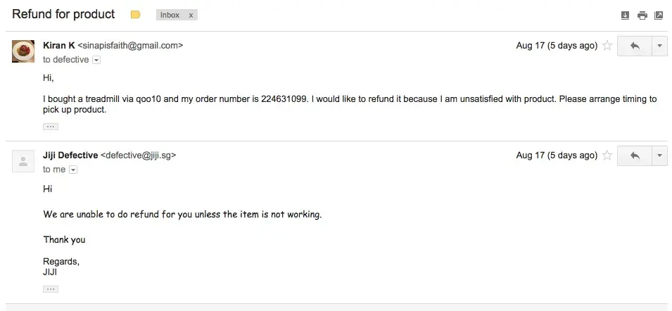 - I was unsatisfied with the quality of product and wanted a refund. The Qoo10 side said that refund was possible but [protected]@[protected]@sg (an email of JIJI Sports) said it was not possible. I called the company up and they admitted that the qoo10 website was NOT run by them? How could this be? How can a company not be in charge of their own website? (See picture)