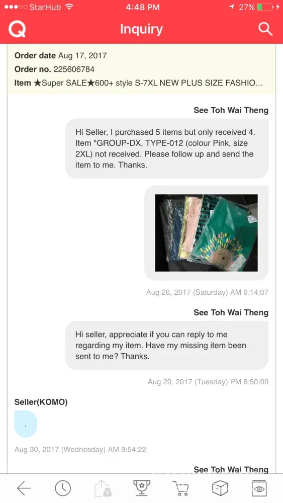 I purchased 5 items from this seller "KOMO" but only received 4 items. I enquired about it and waited for 5 days before the seller replied with a ".". What's that reply supposed to mean? A responsible seller should at least let me know the status of my missing item. And if the item is out of stock, let me know if they want to do a refund. This kind of reply is totally not acceptable. Please assist to check and get back to me. I can screenshot my enquiries to the seller for your reference if need be. Thanks!