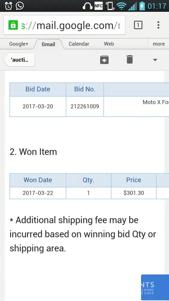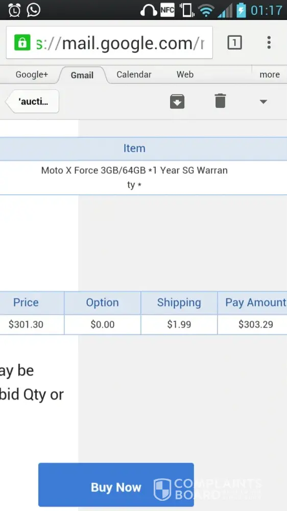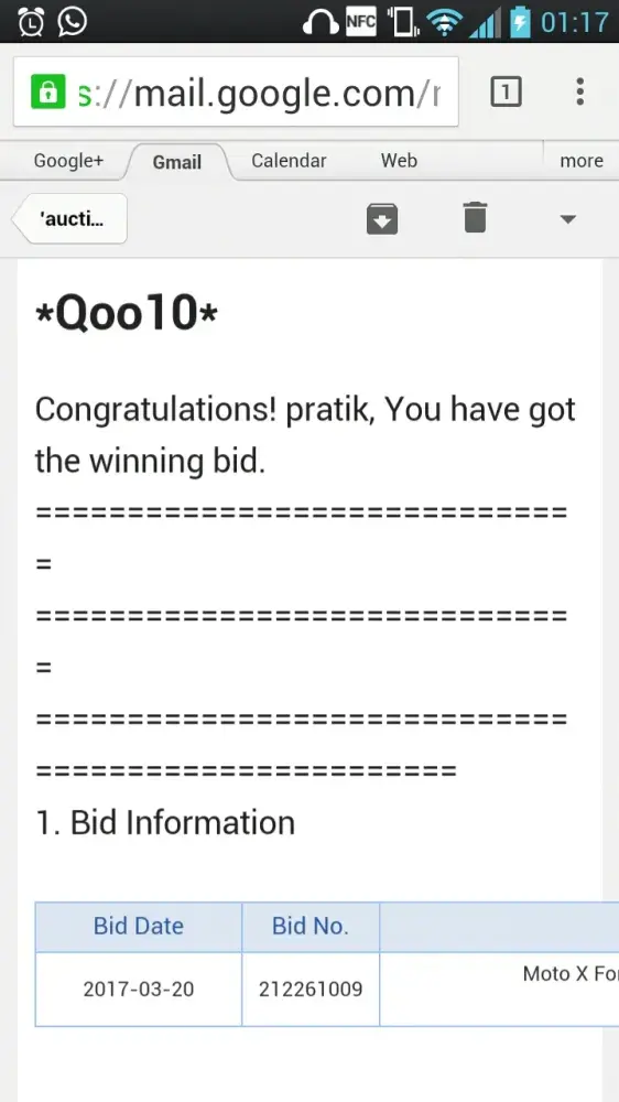 My name is Pratik Damani and my email address is pratik.[protected]@gmail.com. I have won the auction bid for ` Moto X Force 3GB/64GB *1 Year SG Warranty * ` Item Code [protected] and seller name is Infinity-Mall. I have already made the payment as well of $303.30.