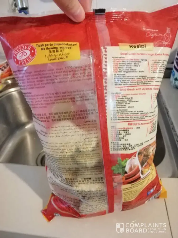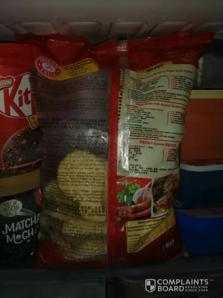 Bought 1 ayamas golden chicken nugget bag at 99 Speedmart at Sunway. Mentari on 9/12/19. When I bought at the store, the condition of bag was normal and took from fridge. The duration time from store to house is 5 minute only and I stored in freezer immediately went home. However on 21/12/19, i took the ayamas from freezer but the bag is filled with higher vacuum which it is not normal. I do not open this pouch bag because it have high risk of food safety. Please investigate this and come back with me with your investigation result & your corrective action at my email.