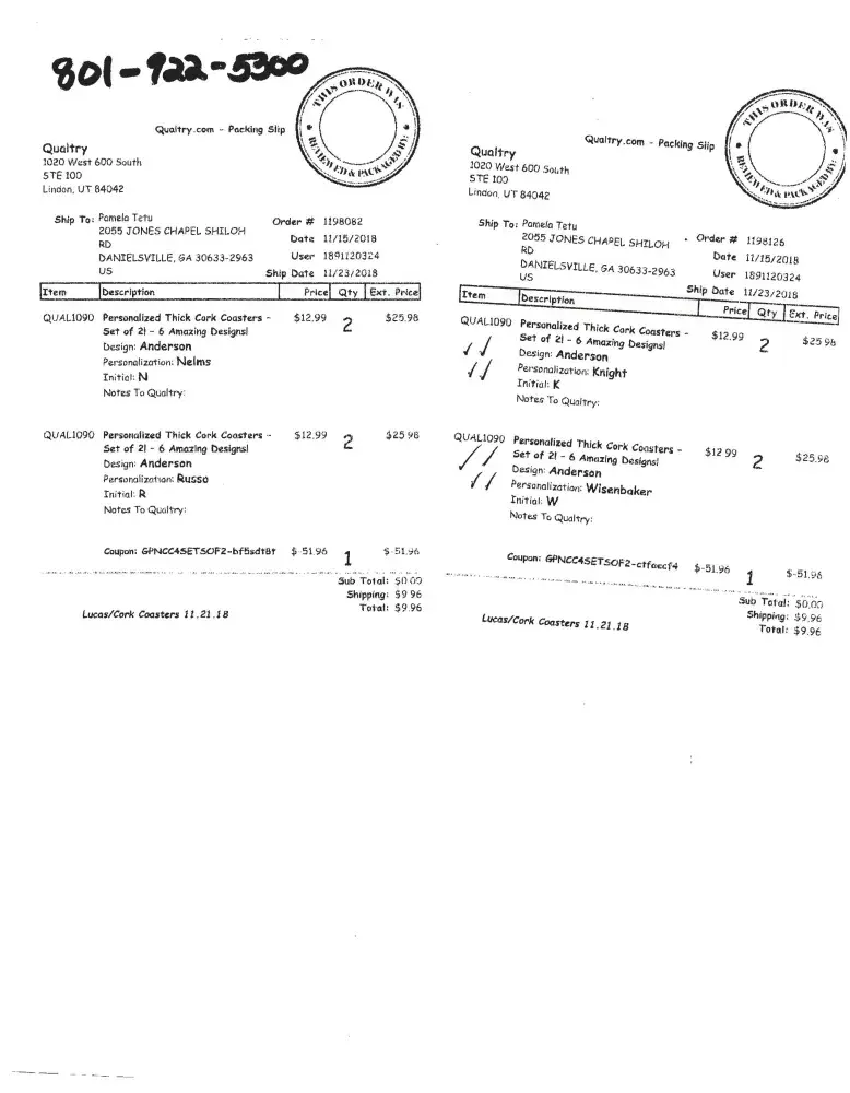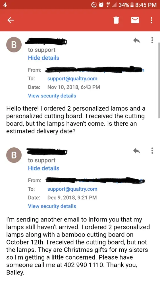 I placed 4 separate orders with this company on November 17th. According to their website, they priduce the items within 7-10 business days from the order date and then there's an additional 3 days to ship. All of the items I ordered were Christmas gifts. I only recieved 2 of the 4 orders before Christmas (well over a month later) and one of the orders (monogrammed wooden spoon & fork) was chipped. I just received my 3rd order on January 5th and still have not received the 4th order (and today is January 12th). In addition, I made numerous attempts to contact customer support (which can only be accessed through email) and received no help & have not been given any type of compensation. According to their website, you can have a "live chat" through Facebook messenger, which is a lie. I attempted to "chat" with them on 4 different occasions and no one responded. This company is incompetent and something needs to be done so they don't continue to scam other customers. I had to purchase other gifts to replace the ones Qualtry didn't send me in time for Christmas, which was extra money out of my pocket. I'm disgusted and will tell everyone I know about my experience see...i they don't make the mistake of ordering from them.