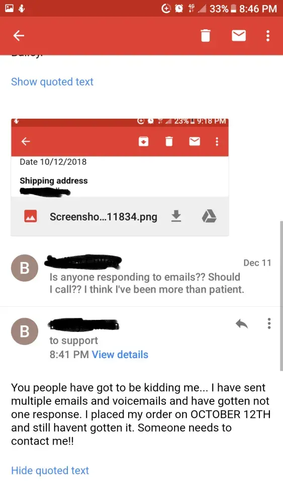 I have been trying to contact Qualtry since December 20th in regards to my 2 orders that were placed earlier in December 2018 and were told they would be delivered before Christmas and have not spoken with anyone, is there a problem with the answering machine or email server or do they just like receiving money from customers and not giving them the product that they purchase?