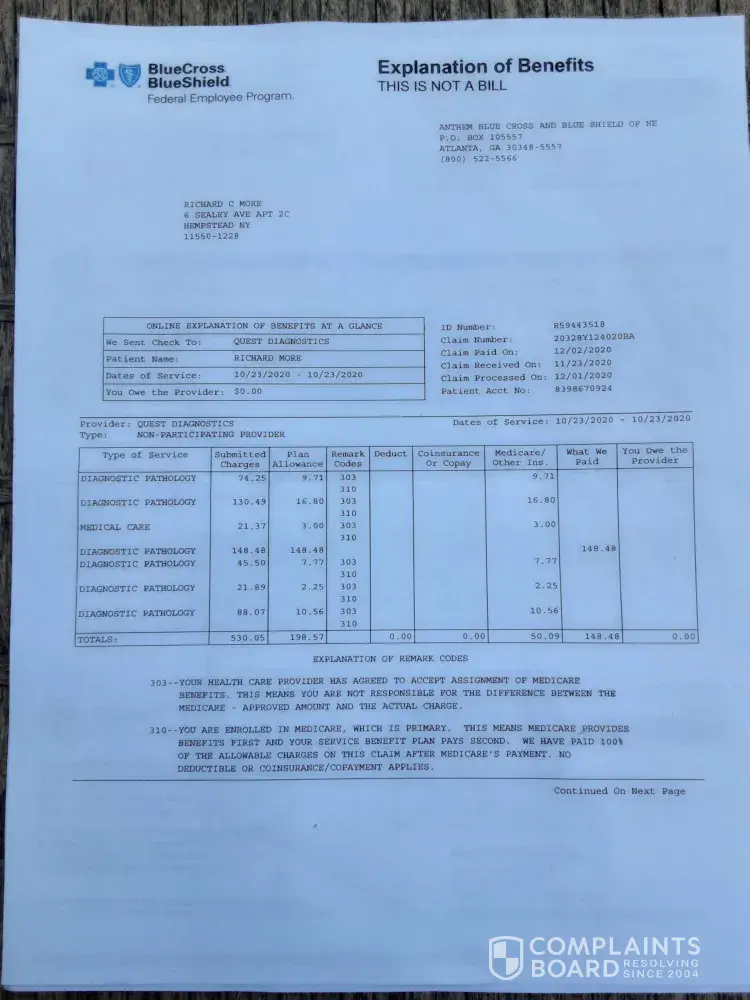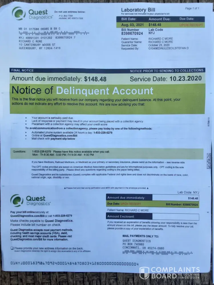 Quest Diagnostics Billing complaint