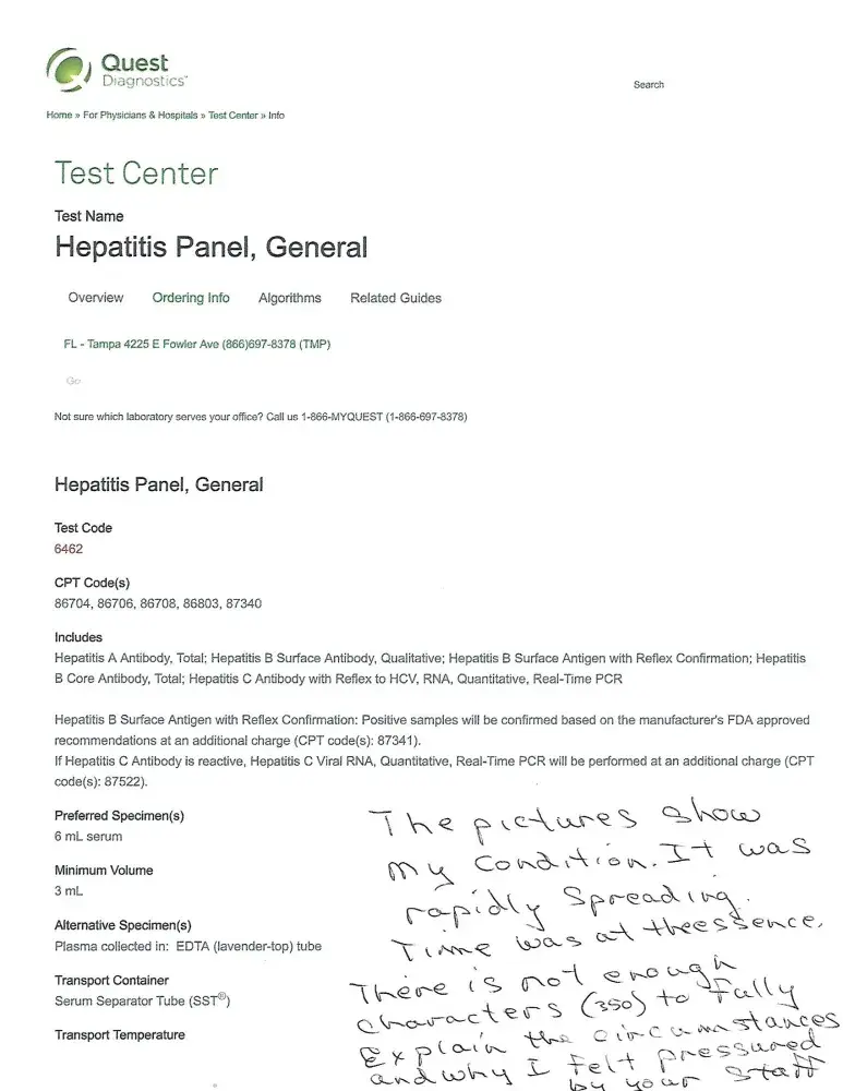 On April 17, 2018 I saw Julie White a PA at Florida Dermatology for the first time. I have a condition called guttate psoriasis. I have had this condition for years and have always been prescribed Methotrexate for it. Miss White said she was was not comfortable prescribing the Methotrexate and suggested Humira. I didn't know anything about Humira but I figured she knew what she was doing. She said that I would have to have blood work first before I could get it. I already had a breakout on my side and it spreads rapidly so I went immediately to Quest in Inverness, Florida. Upon arrival I signed in and waited. When my name was called I was told that they only do these tests after 2 p.m. I returned that afternoon only to be told that the system was down and they couldn't do the tests. The next day April 18, 2018 I decided to go to Quest in Beverly Hills, Florida for the tests because it was closer to my house. By now my psoriasis had already spread to my arms and stomach and was getting worse. When I arrived at Quest and signed in and waited. When they called my name I was told that I had to sign a form because Medicare might not pay for these tests. I didn't understand I have been getting blood work at Quest for years and Medicare has never refused to pay. Why would Miss White order blood work knowing that I was on Medicare that would not meet Medicare approval. I said that I would like to make a phone call to Medicare to be sure. I could not get a signal so I went outside but still could not get a signal anywhere. I went back inside and was told that it was really hard to get a signal in this area. I asked what would happen if I signed the form and Medicare didn't pay? I was told that Medicare probably would pay but if I didn't sign I couldn't get the blood work and there were other patients waiting. I was upset and very stressed. I felt pressured. If I didn't get the blood work I couldn't get the Humira and my psoriasis would keep spreading. I was desperate and didn't know what to do. I felt like I had no choice but to sign honestly believing that Medicare would pay. I was not told what the charges would be. I thought that if Medicare didn't pay all I would have to pay would be what Medicare would have paid had the charges been approved it.