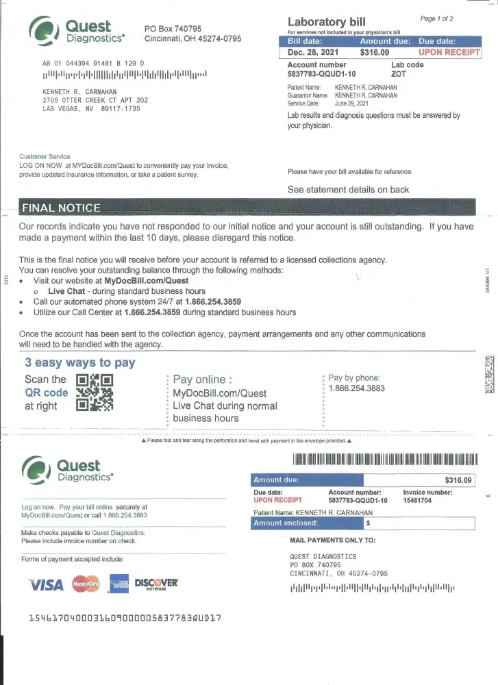 I have medical insurance and quest is in my network. I received an invoice from Quest 5 months later depending money immediately for the full amount. I called Quest immediately and spoke to a rep who confirmed Quest was in network with my medical insurance. He stated he will put in a billing dispute. The next month I received another bill following a full amount demand letter from a collection agency. I called Quest again that new rep stated she has removed the collection. The next month, the collection letter was received again. I called CCS and explained I am being falsely sent to a collection agency. I asked if CCS if Quest contacted them to remove my collection and was told no. I was forced to set up a payment plan to pay the full amount of the bill. Remind you Quest is in network with my medical insurance. I was forced to pay 860.00 which was finally paid off 2/15/22. I just received another invoice on 2/23/22 demanding another 25.15.