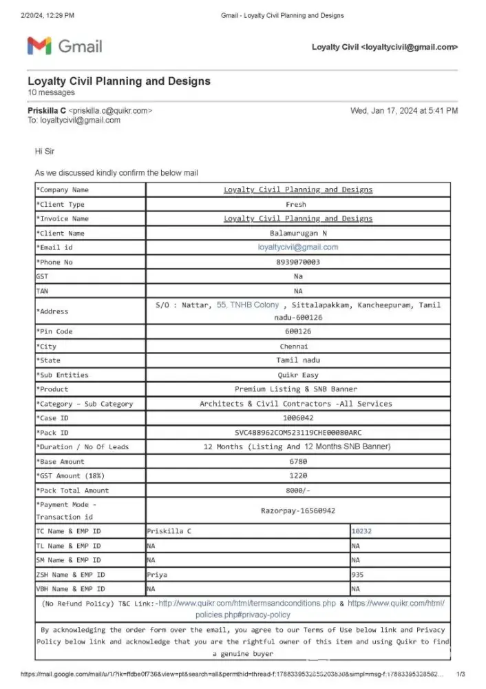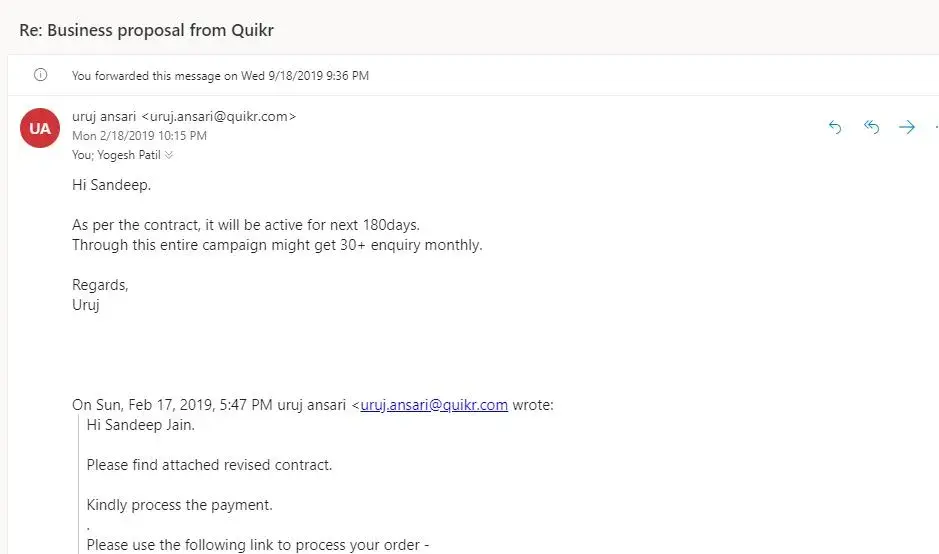 Sandeep Jain Its a fraud company. Do not get trapped by their marketing tactics. Our company, Cybrowse Digital Solutions Pvt. Ltd, had registered for Quikr Easy Business Services on 21.02.2019. Under this service contract, Quikr was supposed to share genuine business leads to Cybrowse Digital Solutions Pvt. Ltd. The pack order ID for this contract is - SVC388934COM336576HYD00103SFT