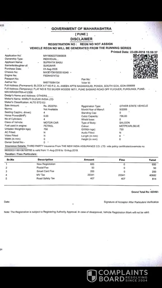 I had applied for quikr rto services online. It was about re register ing and transfer from goa rto to pune rto