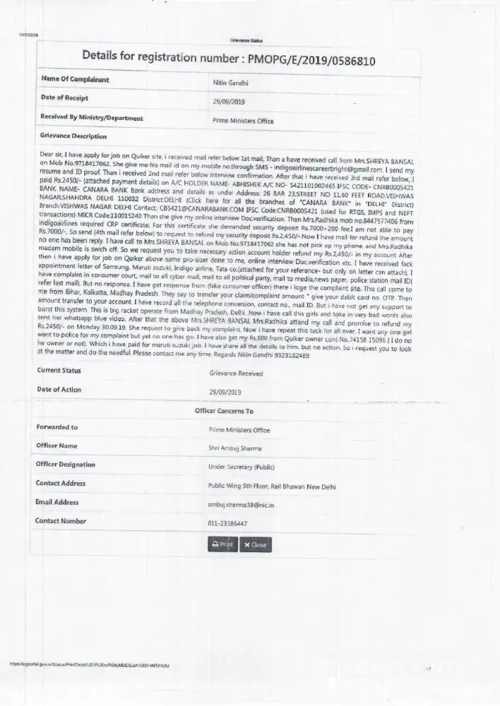 I recently had an experience with Quikr.jobs that I wanted to share with others. I applied for a job on their website and received a call from a woman named Soniya Sharma. She asked me to pay a registration fee of Rs. 29 in order to submit my application to different banks for a telephonic interview. I followed her instructions and paid the fee, but then received a message that Rs. 2929 had been debited from my account to Pay U money. I called Soniya and she told me to fill out a refund form, but instead, two more charges of Rs. 2929 were debited from my account.