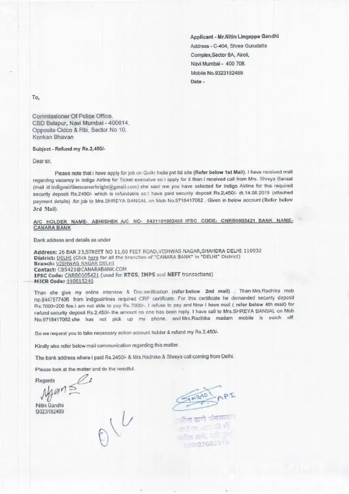I recently had an experience with Quikr, specifically with their job application process. My name is Shikha Rawat and I applied for a job on their website. I received a call from a woman named Richa Sharma, who works at the Quikr head office. She informed me that I had been selected for a job at HDFC bank and that I needed to pay Rs. 1750 for a bank form. Richa assured me that this amount was refundable.